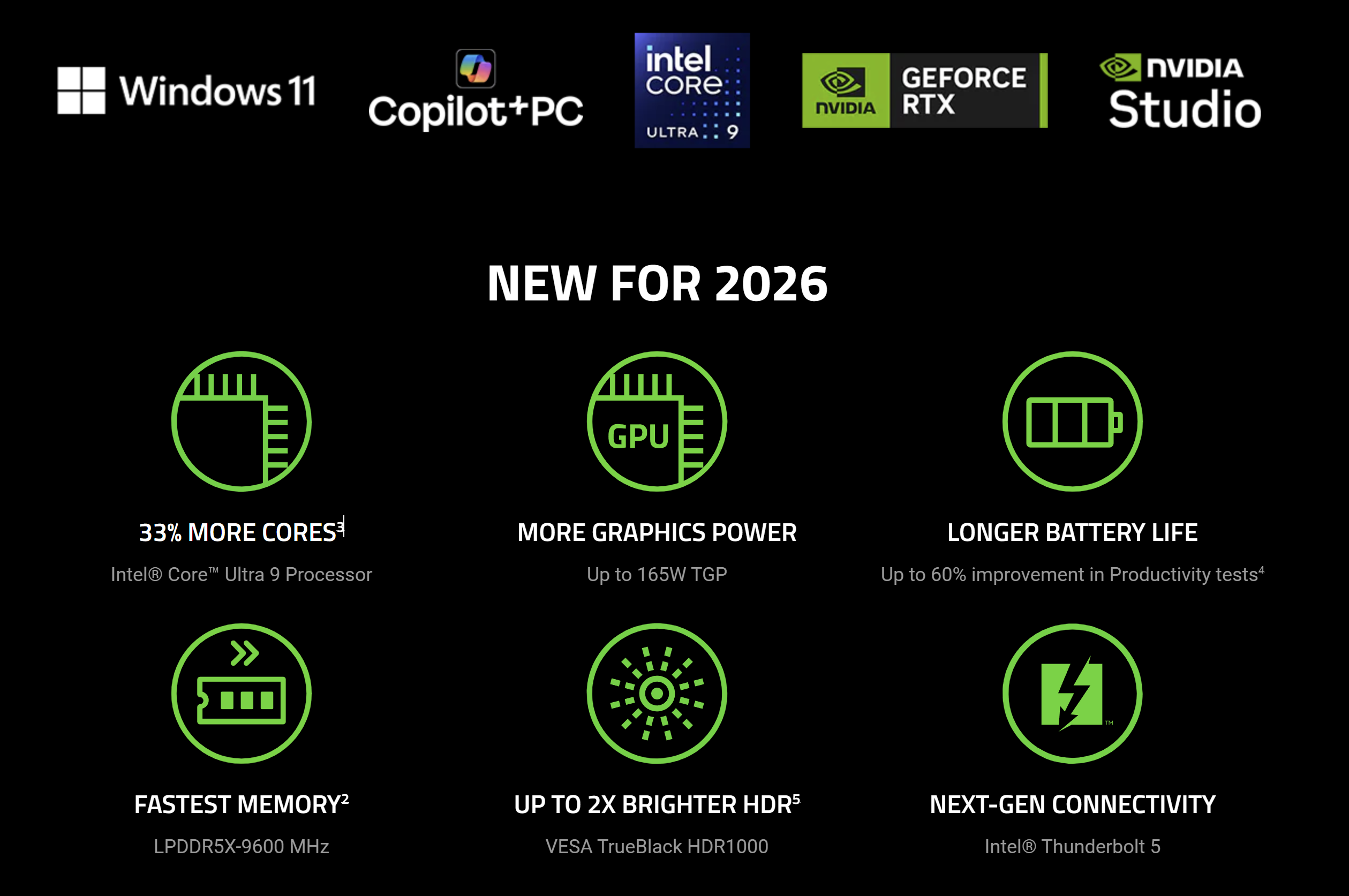 显卡方面,新品最高搭载英伟达GeForce RTX 5090移动显卡,同时提供RTX 5080版本可选,其中RTX 5090版本实现了165W TGP的满血性能释放,基于Blackwell架构打造,支持DLSS 4.5超分辨率与多帧生成技术,可带来极致逼真的游戏画面与超高帧率表现;同时搭配NVIDIA Studio专属驱动,能为专业创作软件提供深度优化与性能加速,兼顾游戏与创作双重需求。内存与存储方面最高配备64GB LPDDR5X-9600高频内存,同时提供32GB版本可选,可轻松应对多开大型软件、高清视频剪辑、3D建模等重度多任务场景;存储方面配备双M.2插槽,标配1TB/2TB PCIe 4.0 NVMe SSD,支持用户后续自行扩容,满足大容量素材与游戏的存储需求。