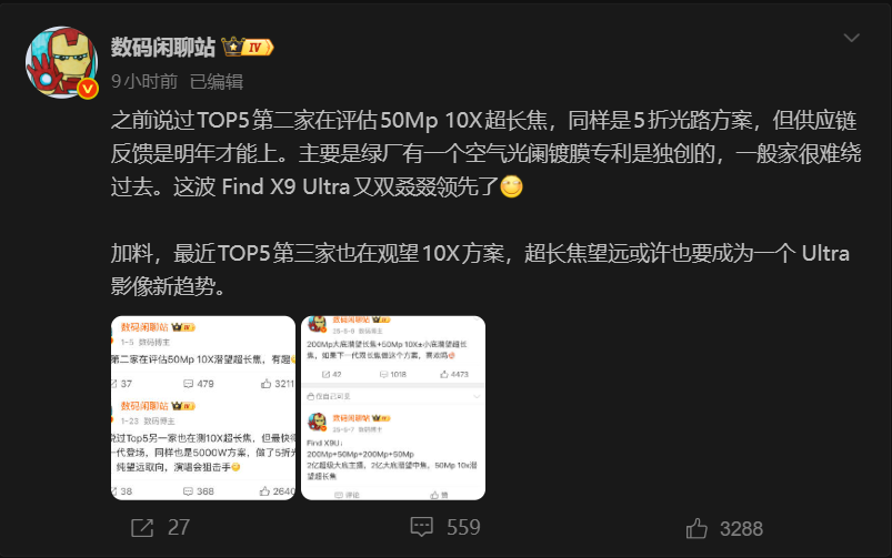 新一代夜神!OPPO Find X9 Ultra搭载行业最大底3X镜头