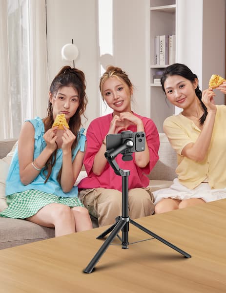 不是指折叠便携,而是指“能架着拍”。好的稳定器应该自带稳定的支撑系统——展开就是三脚架,拉长就是延长杆。这样你不需要额外带支架,也不用找东西靠。架在桌上拍合影,拉长杆子举高拍俯视,它都能稳稳立住。框选目标后自动跟拍,你该端菜端菜,该敬酒敬酒,该逗孩子逗孩子——这才是真正的“放手”。