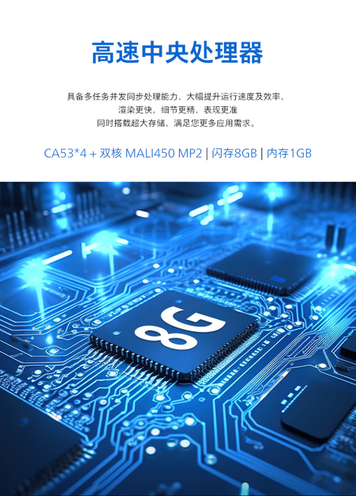 采用高速中央处理器,具备多任务并发同步处理能力,大幅提升运行速度及效率,渲染更快、细节更精、表现更准,同时搭载超大存储闪存8GB+内存1GB,满足更多应用所需。