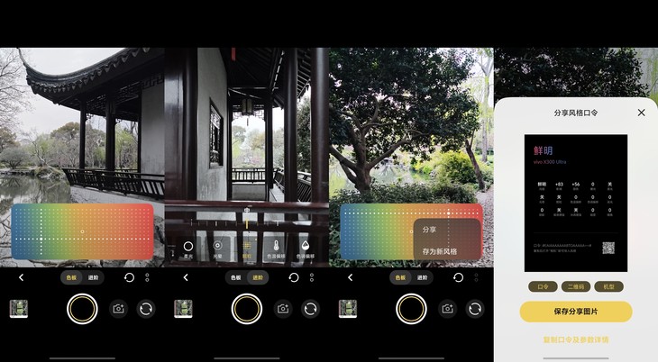 它还带来了更高阶的玩法“蓝图调色盘”,在不同的风格下,还可以自定义调节色彩风格、颗粒感、光晕。冷暖调等多种选项,自由度非常高,而且可以保存和分享方案,以共创的形式,进一步提升了手机影像的可玩性和专业性。