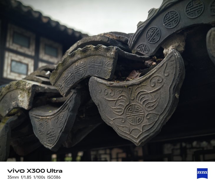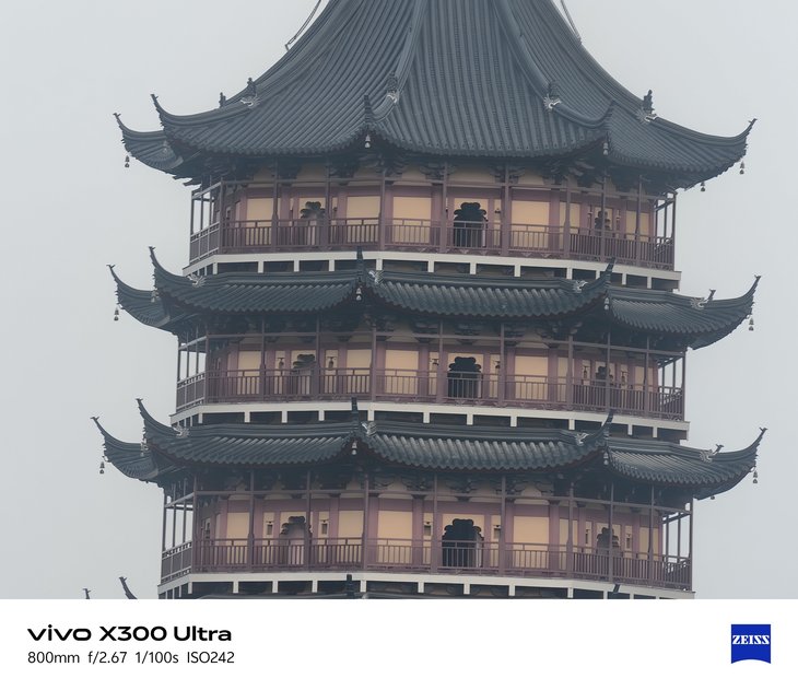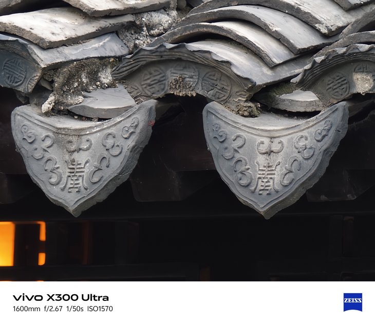 用它拍摄前方距离十几米的建筑,即使拉到1600mm焦段,依旧能清晰地还原瓦片的细节,且没有明显的AI痕迹。