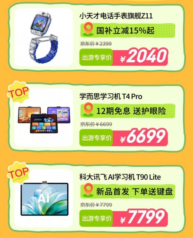 春日出游研学,安全与陪伴缺一不可。小天才电话手表旗舰Z11作为专为儿童打造的出行安全神器,搭载高精度定位技术与高清双向通话功能,家长可以随时掌握孩子的位置动态,京东3C数码出游季期间,享国补立减15%起,预估到手价2040元。学习装备方面,学而思学习机T4 Pro搭载学而思的全学段教研内容体系,覆盖同步课程、素养拓展、AI辅导等核心功能,既能满足孩子日常课业学习需求,也能在研学途中拓展知识边界,活动期间享12期免息,加赠护眼险,出游专享价6699元。科大讯飞AI学习机T90 Lite新品首发,凭借强大的AI交互能力、精准的学情诊断功能与海量正版学习资源,成为亲子研学的优质之选,下单即赠键盘,出游专享价7799元,为研学之旅增添智慧陪伴。