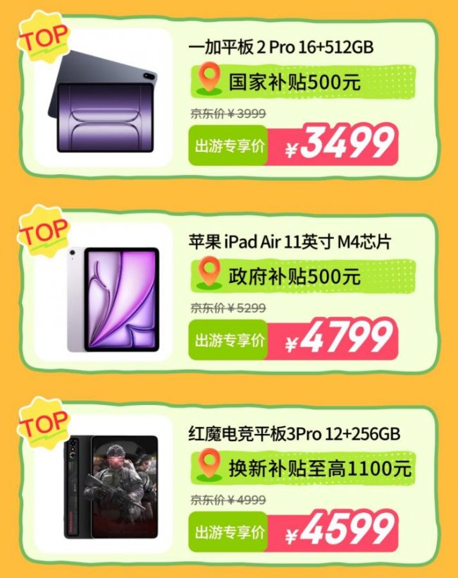 一款性能强劲、体验出众的平板,既能满足孩子研学途中的学习、记录需求,也能适配家长出行途中的办公、娱乐需求。一加平板2 Pro 16+512GB版本,搭载旗舰级性能配置,超清大屏、超长续航完美适配出行场景,国家补贴500元,出游专享价3499元。苹果iPad Air 11英寸M4芯片,凭借轻薄便携的机身、强大的芯片性能与流畅的iOS生态,成为亲子家庭出游的热门选择,活动期间可享政府补贴500元,出游专享价4799元。红魔电竞平板3 Pro 12+256GB版本,超强的性能配置不仅能满足孩子的学习创作需求,也能带来极致的娱乐体验、轻松化解旅途无聊,活动期间可享换新补贴至高1100元,出游专享价4599元。