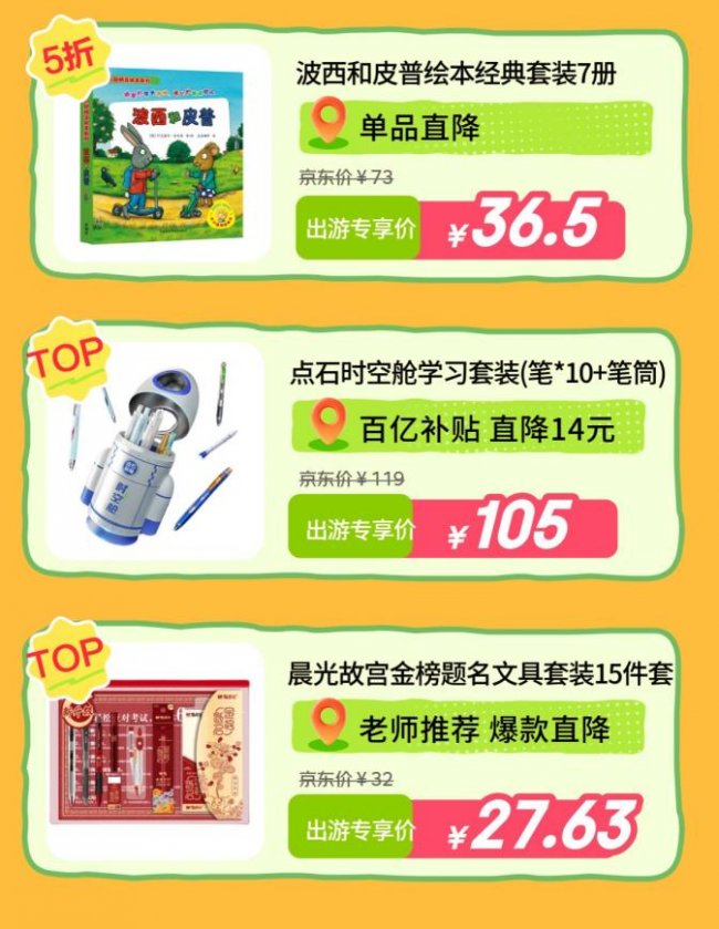 多款高性价比的文具、绘本好物,让孩子随时随地都能开启启蒙学习。《波西和皮普绘本经典套装7册》作为风靡全球的儿童启蒙绘本,画风温馨、故事有趣,是旅途哄娃、亲子共读的绝佳选择,活动期间单品限时直降,出游专享价仅36.5元。点石时空舱学习套装内含10支笔加笔筒,顺滑好写、便携收纳,百亿补贴直降14元,到手价105元。晨光故宫金榜题名文具套装15件套,作为老师推荐的爆款文具套装,兼具国风设计与实用性,轻松满足孩子研学出行的书写需求。活动期间爆款直降,27.63元可以入手。