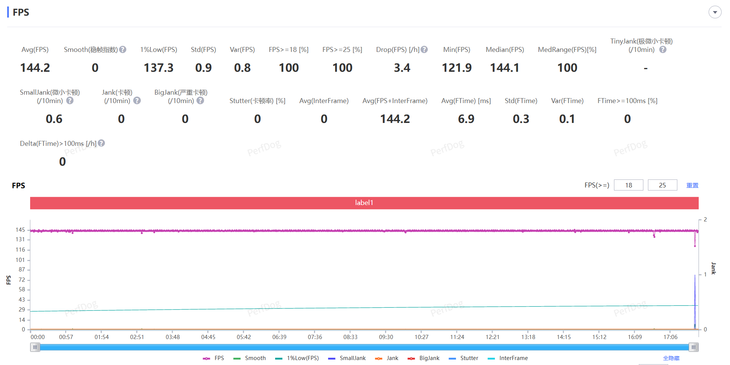《王者荣耀》PerfDog测试平均帧率为144.2fps