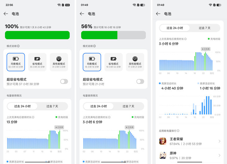 续航方面,OPPO K15 Pro配备7500mAh冰川电池,搭配80W超级闪充,彻底解决用户的续航焦虑。7500mAh超大容量电池,我们实测数据显示,《王者荣耀》144fps极致帧率将近3小时,以及20分钟60fps帧率《原神》游戏后的重度使用,依然还有56%电量,出差、旅行基本上无需携带充电宝。