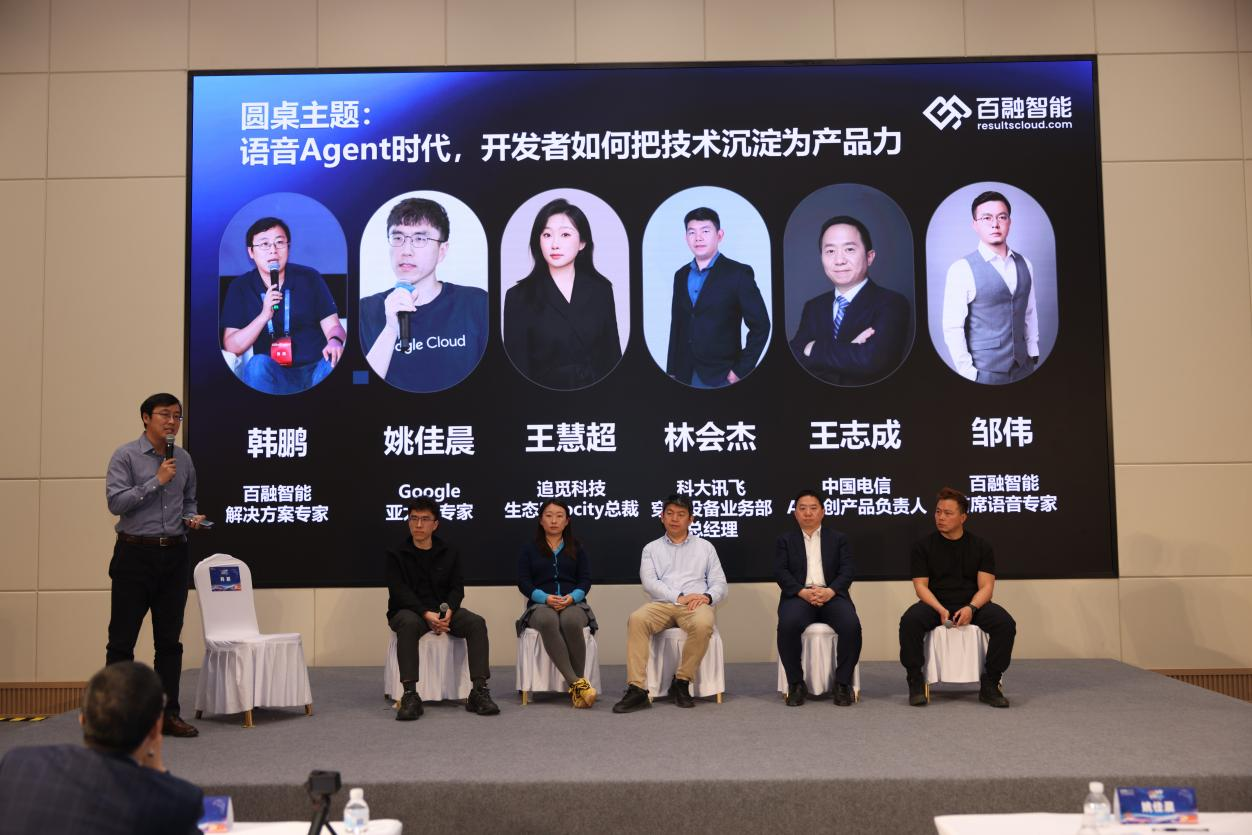 技术的价值终要落地为产品力,本次专场设置高端圆桌对话,围绕“语音 Agent时代,开发者如何把技术沉淀为产品力”核心主题,百融智能专家与各行业大咖展开深度交流,凝智行业共识,共同探讨RC生态下语音Agent技术在智能硬件赛道的产品化路径。