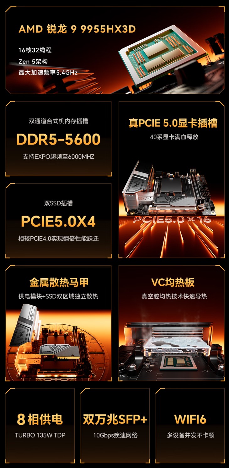 核心硬件上,这款主板搭载的AMD锐龙9 9955HX3D处理器,采用台积电4nm工艺制造,基于Zen 5架构打造,拥有16核心32线程规格,最大加速频率可达5.4GHz,凭借3D V-Cache技术实现了144MB L2+L3超大缓存,为游戏与多线程任务提供旗舰级算力支撑。为充分释放这颗处理器的全部性能,天钡为其专属设计了VC均热板散热器,依托真空腔均热技术实现核心热量的快速均匀传导,同时搭配金属散热马甲,为供电模块与SSD提供双区域独立散热,整套散热方案可稳定支持135W Turbo TDP性能释放。