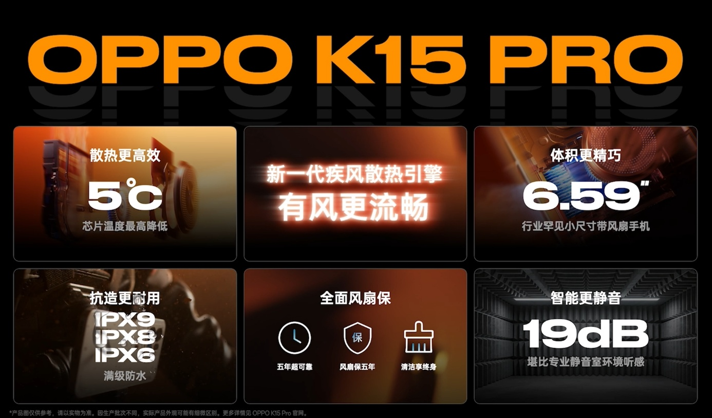 散热能力是决定高性能持久释放的基石,此次 OPPO K15 Pro 系列搭载的新一代疾风散热引擎,在散热效率、体积控制、耐用性、静音表现等多个维度全面领先。