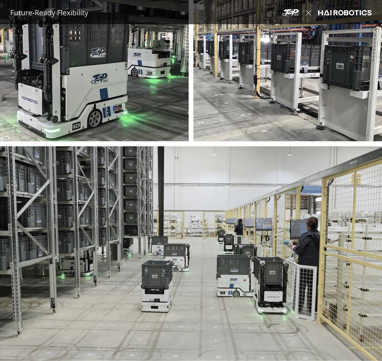 在一期项目中,海柔配置了18台闪攀机器人、8套缓存货架入库工作站、7套人机直拣出库工作站,搭建起基础智能仓储架构,实现入库、出库全流程自动化,满足初期业务履约需求;二期项目在一期基础上按需扩容,增设12台闪攀机器人、4套缓存货架入库工作站、5套人机直拣出库工作站,进一步提升集群作业能力与站点处理效率,从容应对业务增量与订单洪峰。