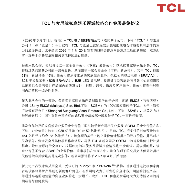 公告同时公布了合资公司的核心管理团队架构,木井和夫(Kazuo KII)将出任代表董事、董事长兼首席执行官(现任索尼公司执行副总裁,2026年4月1日起任索尼公司副董事长),姜彪(Biao JIANG)与平井文笃(Fumiatsu HIRAI)共同担任董事兼联合首席运营官,罗斌(Bin LUO)与中村博(Hiroshi NAKAMURA)担任非全职董事。交易完成后,BRAVIA Inc.将成为TCL电子的合并子公司,同时作为索尼的权益法核算关联公司。对于此次合作,即将于2026年4月1日出任索尼公司代表董事、总裁兼首席执行官的田中健司表示,非常高兴能与TCL签署家庭娱乐领域战略合作的最终协议,获得了一位卓越的合作伙伴,通过新公司将努力为全球消费者提供新的客户价值,实现家庭娱乐业务的进一步增长。TCL电子控股有限公司董事长杜娟则称,对与索尼在家庭娱乐领域的未来战略合作充满期待,双方将共同发挥在品牌、显示技术、销售渠道、供应链等方面的核心优势,推动新公司的全球发展和高端化,为全球消费者提供卓越的产品和服务。即将出任BRAVIA Inc.董事长兼CEO的木井和夫补充道,很兴奋能开启家庭娱乐领域的这一新挑战,索尼和TCL都拥有非凡的实力,新公司将汇聚这些专业知识,全力开发超越全球客户期望的创新产品,并通过卓越的运营能力引领市场。此次交易尚需获得相关监管部门的批准并满足其他交割条件,索尼与TCL均表示,将全力支持新公司的可持续发展,共同打造全球领先的家庭娱乐品牌。