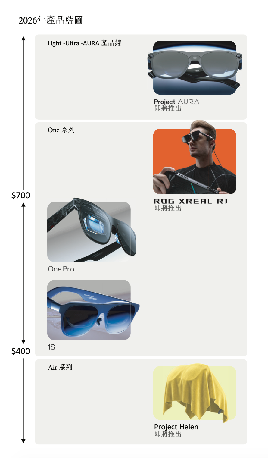 在技术与产品层面,XREAL构建了“自研光机+自研芯片”的核心护城河,旗下Air系列与One系列产品广受全球消费者认可。面对2026年的市场机遇,XREAL公布了全产品线矩阵蓝图,包括:面向大众市场的普及型眼镜“Project Helen”;与电竞品牌ROG(玩家国度)合作的专业电竞眼镜“R1”;以及与Google(谷歌)共同开发、深度集成空间计算与多模态AI能力的下一代旗舰XR产品“Project Aura”等。