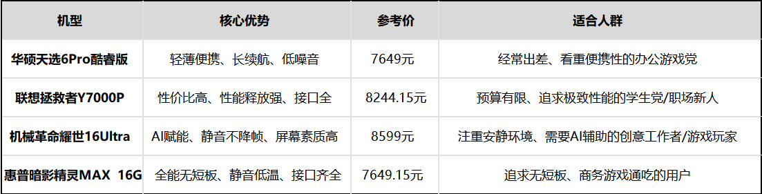 2026 年的 5000 元档游戏本市场,已经不再是“将就”的选择。联想拯救者 Y7000P、华硕天选 6 Pro 酷睿版、惠普暗影精灵 MAX、机械革命耀世 16 Ultra 四款产品,以不同的产品哲学诠释了“性价比高的游戏本”的多元内涵——性能释放、便携续航、屏幕素质、静音体验,没有绝对的优劣,只有与需求的契合。