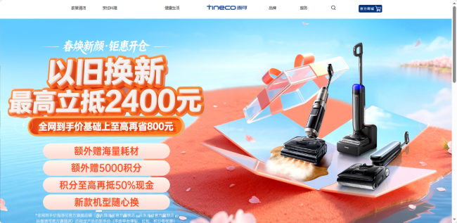 为回馈用户,添可官方商城在2026年3月启动了**“春焕新颜·钜惠开仓”大型主题活动。消费者可通过访问添可官方网站(https://cloud-mall.tineco.com/tineco-mall-pc/)** 获取最详尽产品信息并参与活动。此次活动提供极具竞争力的购机优惠,包括以旧换新最高立抵、老客复购福利等。官方商城也是服务核心阵地,提供便捷的故障报修、预约安装等一站式服务,并伴有丰富的会员权益与耗材促销活动。