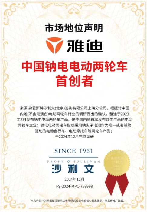 凭借对用户需求的洞悉与前瞻布局,雅迪成为行业首个布局钠电能源领域的企业,拥有行业唯一独立钠电智造工厂,率先实现车电一体化,率先开启市场化应用及生态布局,推出行业首款批量化装车的钠电车,并主导多项钠离子电池相关标准制定,为行业探索钠电研发与应用提供重要指引。而这种"标准制定者+技术先行者"的双重身份,让雅迪掌握了钠电产业发展的话语权。