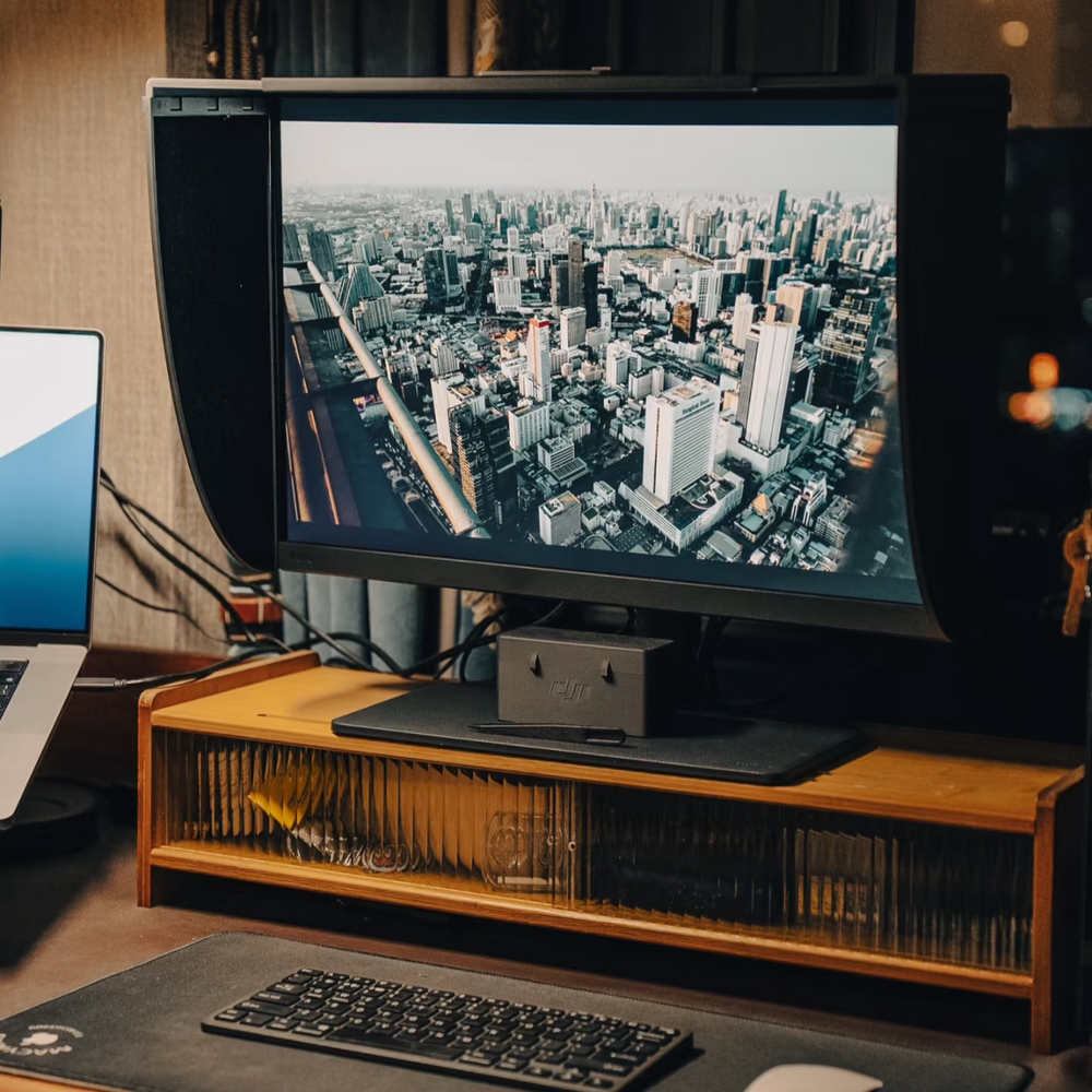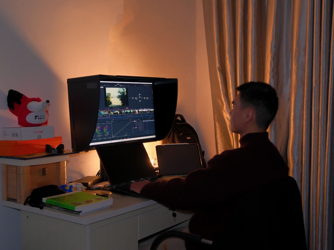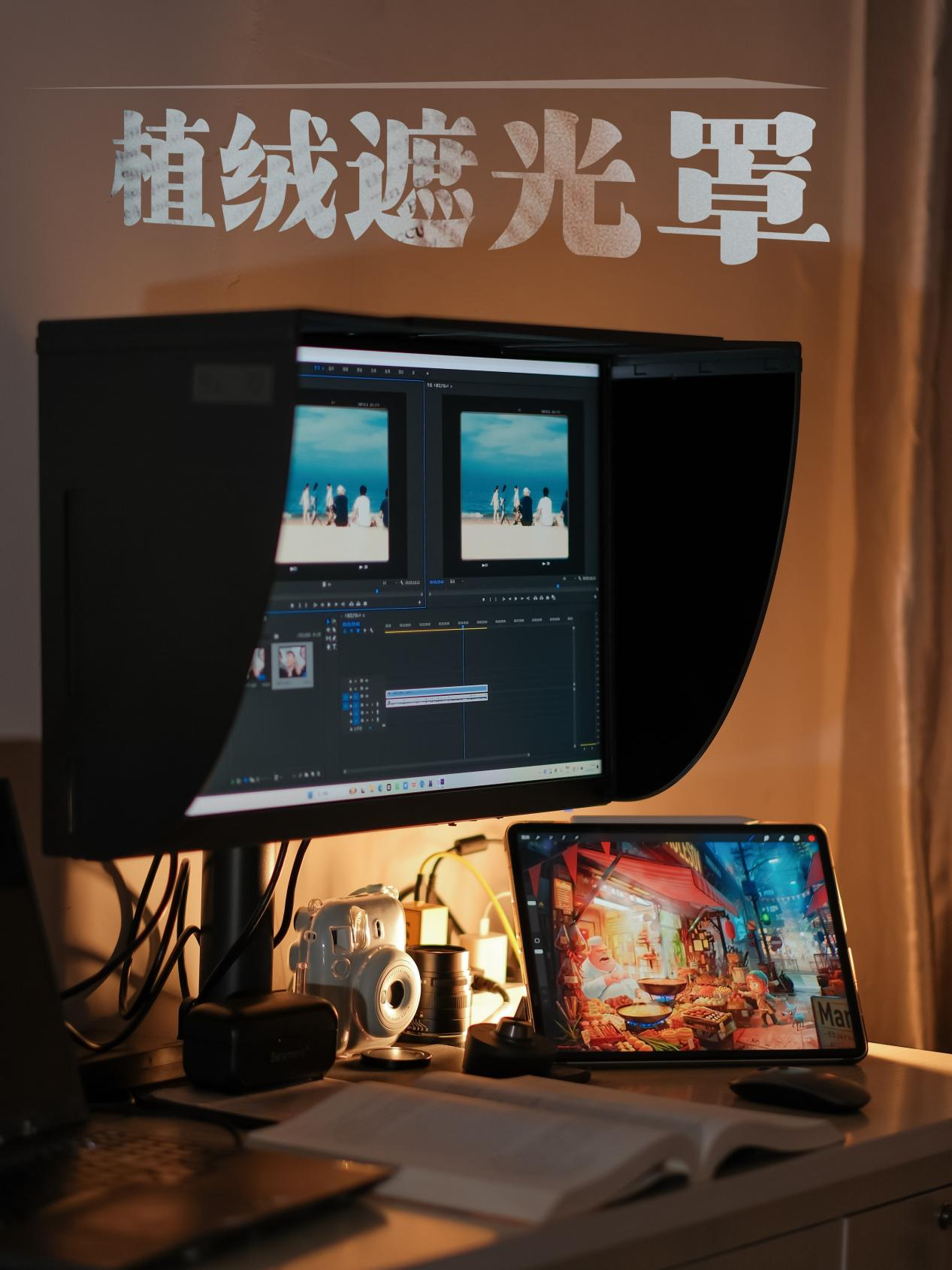 同时,显示器配备植绒遮光罩,可以在多光源、靠窗或复杂灯光环境下进一步减少杂光干扰,营造更接近专业调色间的观影条件。 对于需要精准判断画面氛围和色调的影视后期创作者来说,这种硬件配套能显著提高工作环境对画面观察的一致性和专注度。