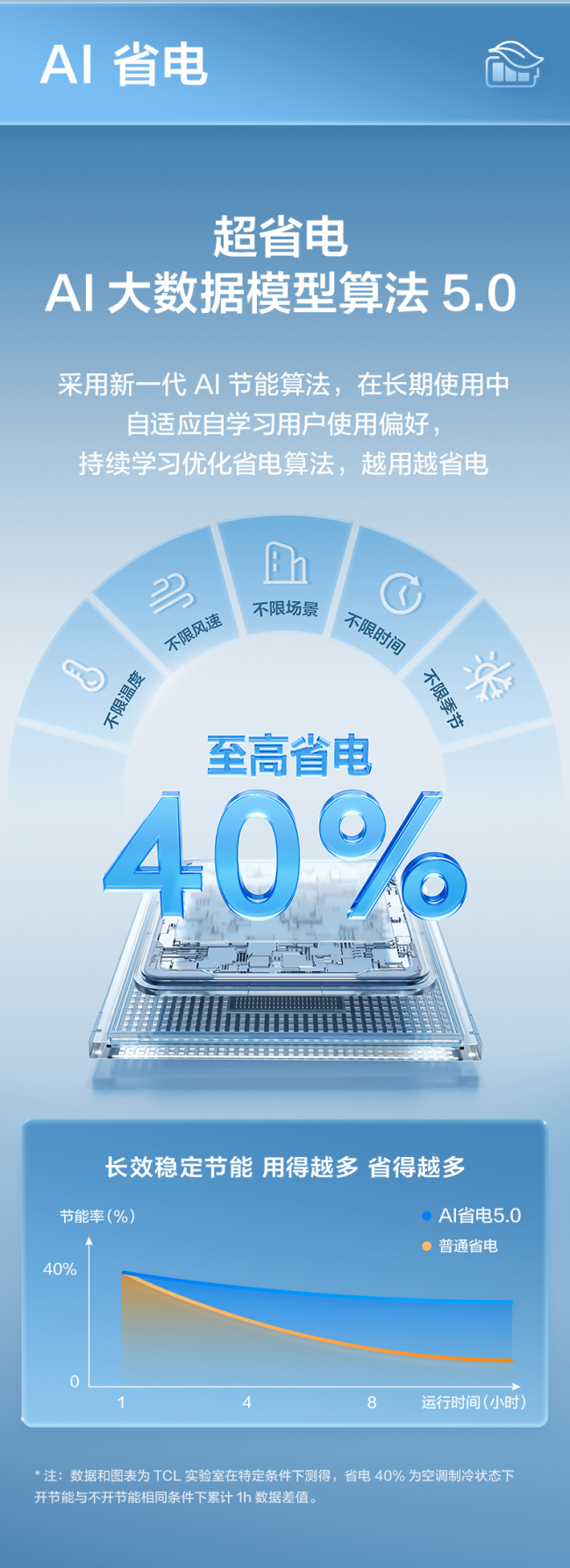 面对春夏换季及即将到来的夏季用电高峰,电费开支是许多家庭关注的焦点。TCL小蓝翼·全域风Pro AI健康舒适空调搭载了升级的超省电AI大数据模型算法5.0,采用新一代 AI节能算法,在长期使用中自适应自学习用户使用偏好,持续学习优化省电算法,越用越省电。