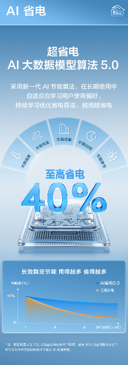 春季气温波动大,空调需频繁切换制冷、制热、除湿模式,易导致能耗飙升,增加家庭电费支出。TCL小蓝翼·全域风Pro AI健康舒适空调搭载超省电AI大数据模型算法5.0,采用新一代AI节能算法,可自适应自学习用户使用偏好,比如常用温度区间、开关机频率,持续优化省电算法,长期使用至高可省电40%。