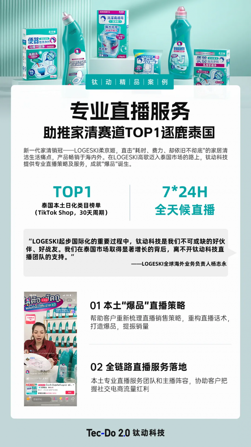 LOGESKI的故事,为“家庭清洁用品直播”这个命题写下一个生动注脚。它证明了一个道理:在低价横行的东南亚市场,“黑科技”产品不需要降价妥协,而是需要用直播重新定义价值。当用户亲眼看到免刷洁厕剂的神奇效果,当主播用本地化的语言反复强化“倒等冲”的动作记忆,产品的技术溢价就被用户心甘情愿接受。钛动科技的角色,正是那个“价值翻译器”——将复杂的技术参数翻译成用户看得懂的动作,将陌生的品牌翻译成用户信得过的朋友。当LOGESKI在泰国TikTok Shop上持续霸榜,当越来越多的泰国家庭开始使用“免刷洁厕剂”,中国智造在家庭清洁赛道上的话语权正在被重新书写。出海找钛动,让你的家清产品,在直播间里“开口说话”。