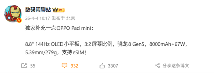 OPPO即将发布首款性能小平板——OPPO Pad mini,该机将在本月与OPPO Find X9 Ultra同台亮相。据爆料,OPPO Pad mini配备了一块8.8英寸的OLED屏幕,支持144Hz高刷新率,并采用3:2的屏幕比例,带来更加流畅和细腻的显示效果,特别适合影音娱乐和日常使用。