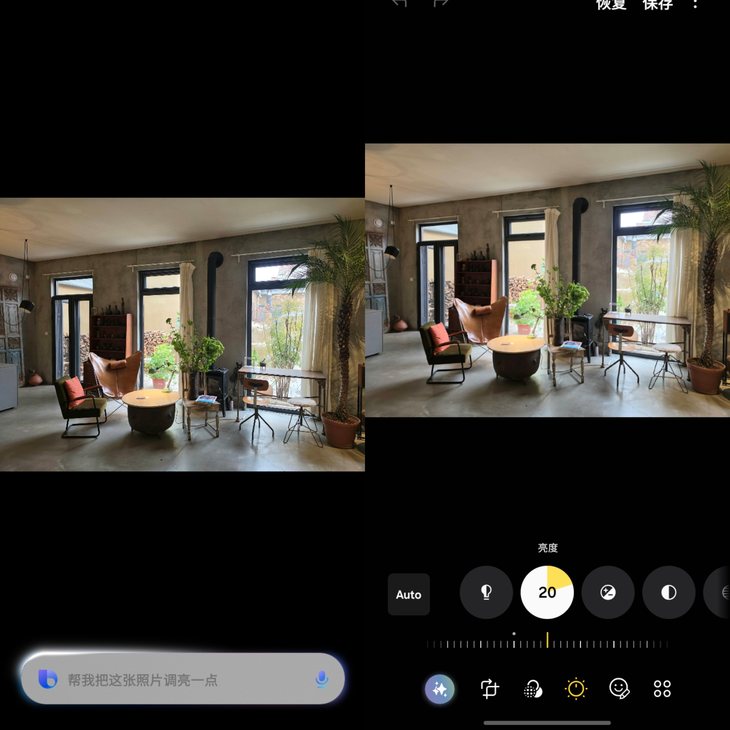首先是对图片的AI后期编辑能力,这也是最让人惊喜的功能之一。内置的照片助手支持对话式修图,用户可以直接像聊天一样告诉它修图需求,AI便能精准理解语义并执行,无需手动进行复杂的修图操作。
