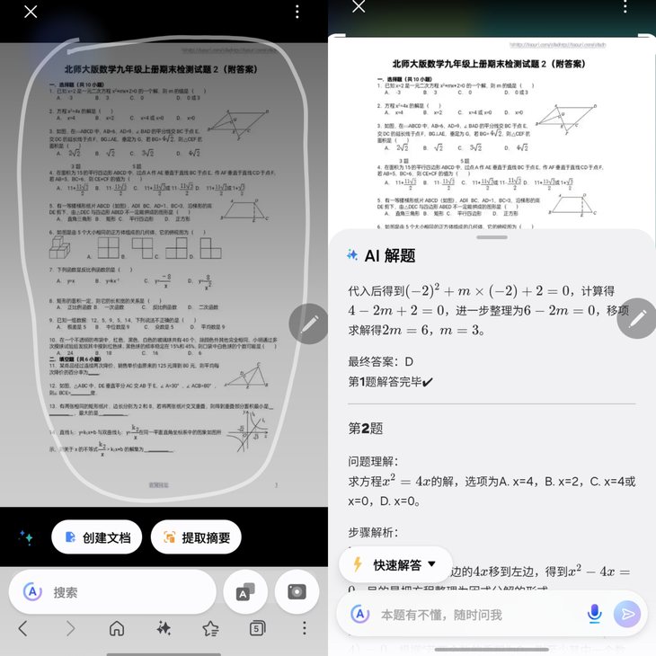 即圈即搜还能用来给学生解题,直接圈选整张试卷的题目,AI就可以将所有题目逐一解答,效率和准确度都非常高。