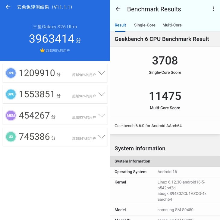 在性能实测中,我们这台三星Galaxy S26 Ultra的安兔兔成绩轻松突破396万,位列当下安卓旗舰的第 一梯队。GeekBench6单核3708,多核11475,同样实力不俗。在日常使用中,无论是多任务切换、大型应用启动,还是浏览高清视频,都能保持极致流畅,没有任何卡顿感。