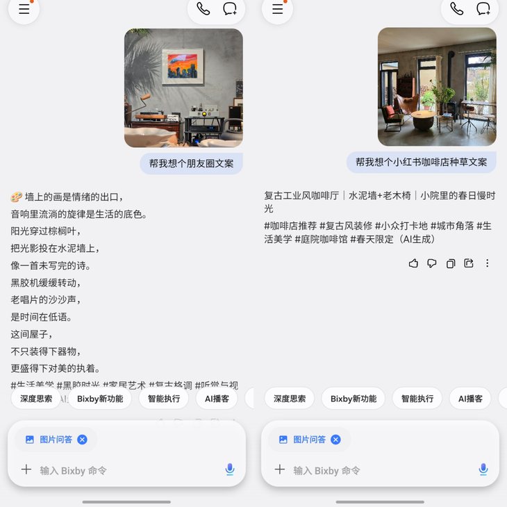 智能文案帮写功能则精准适配社交分享需求,日常拍摄的美食、风景、生活照片,只需丢给Bixby,AI就能快速识别图片内容,根据微信、朋友圈、小红书等不同社交平台的风格,自动生成贴合场景的配套文案,无需费心构思文字。