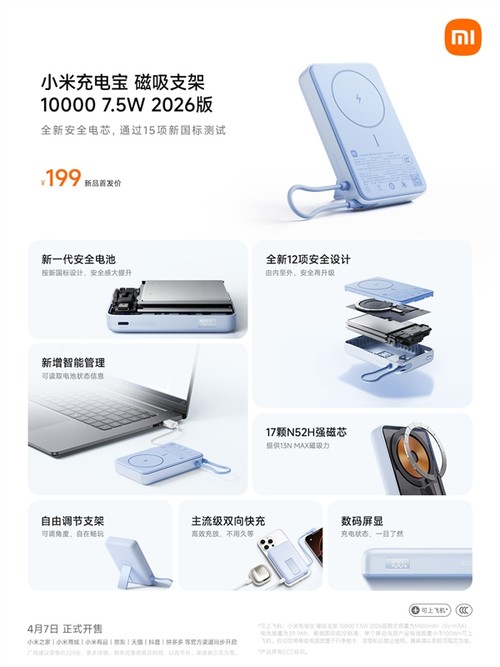 4月8日,小米官方宣布,小米充电宝磁吸支架10000 7.5W 2026版正式开售,首发到手价199元。作为小米首款贴合新国标设计的移动电源,该机严格遵循即将实施的《移动电源安全技术规范》(GB47372-2026),通过15项新国标严苛测试并带有CCC认证,成为新国标落地前的合规标杆产品。