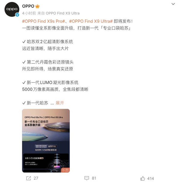 从官方信息来看,Find X9 系列以双2亿像素硬件为基底,叠加丹霞色彩、哈苏调校与多场景功能升级,将专业影像能力进一步下放,两款机型分别瞄准小屏全能旗舰与极致影像旗舰,4月21日的发布会值得期待。