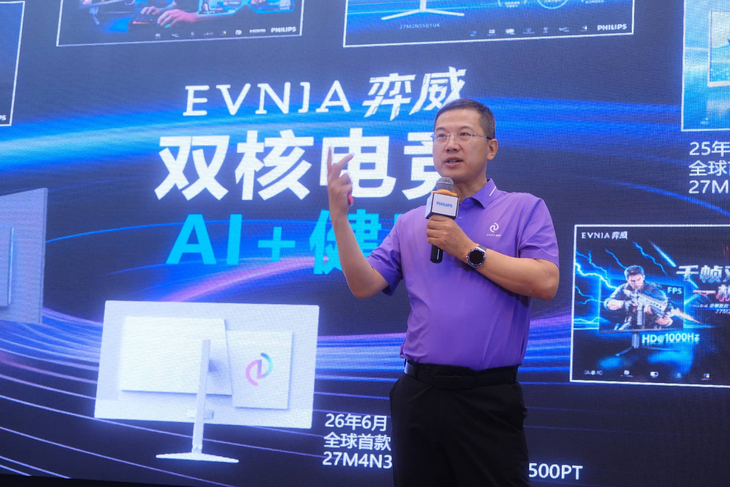 冠捷科技OBM显示器BU中国区B2C销售总经理林为康,以“推动高质量发展”为核心方向,向现场来宾详细分享了2026年B2C及电竞市场的年度运营策略。他强调,PHILIPS与EVNIA弈威双品牌将秉持全域思维,协同产品、渠道、内容三大核心生产力,携手合作伙伴实现营收与品牌价值的跨越式提升。产品端以“AI + 健康”为双核驱动,构建以OLED、Mini LED等为核心的“九星”产品矩阵;渠道端将在电商、网吧、电竞酒店等全域场景发力,携手伙伴在专业电竞显示器市场发力冲刺;内容端则联动专业赛事与优质IP开展全域营销,通过“弈天使”二次元IP深度拥抱年轻用户、为年轻玩家提供专业产品以外的情绪价值赋能。