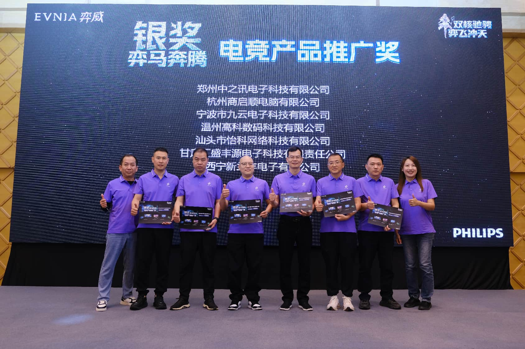 在所有年度策略分享完毕之后,简洁而富有科技感的创意互动仪式,将渠道会的现场气氛推入了高潮。来自飞利浦显示器的三位领导嘉宾阎立东、林为康、于永杰,向大屏幕中的“双E”能量注入了PHILIPS与EVNIA弈威的品牌之力。随后,代表着品牌年轻化策略的EVNIA弈威二次元虚拟形象「弈天使」,与代表着“AI+健康”双核战略的光影飞马一起“弈飞冲天”,引领全体合作伙伴一道,携手开启弈威元年新征程、同心共创双核赋能新辉煌。