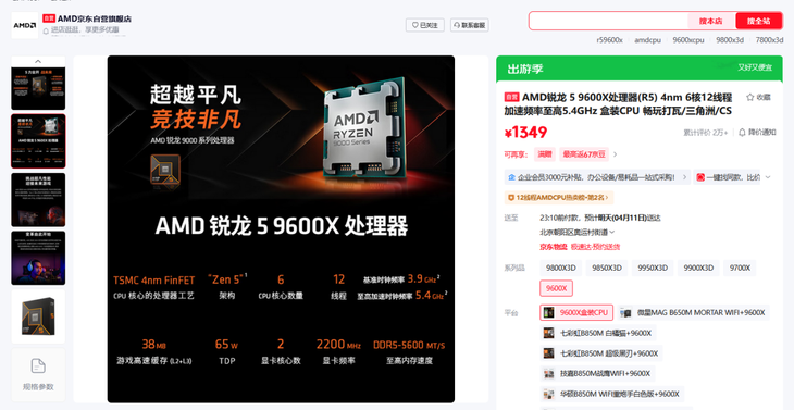 目前AMD 锐龙5 9600X处理器在在京东自营旗舰店的报价是1349元,成为AMD京东自营旗舰店会员还有0元入会抽100元E卡,首购返666京豆和晒单抽AMD定制咖啡杯,加购商品送抽织带挂绳,下单抽AMD信仰周边礼品和冲榜抽电动螺丝刀等活动,近期不仅价格更低,福利更是丰厚。