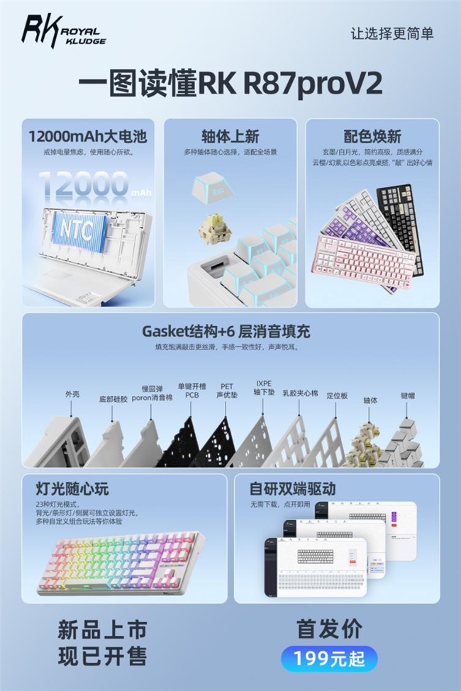 4月8日,RK全新推出R87 ProV2高性能电竞级三模机械键盘,延续百万销量爆品R系列ID设计经典传承,聚焦极致性价比与全能使用体验,以百元价位实现客制化满配电竞性能配置,重新定义入门级机械键盘品质标杆,为学生党、电竞玩家及职场人士带来优质输入体验。此外,首发期间享限时优惠价,购买即赠送RK定制鼠标垫一张,诚意满满。