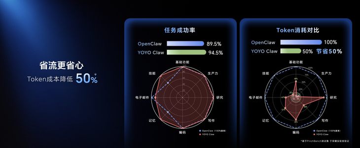 经荣耀实验室基于PinchBench测试集验证,相比OpenClaw方案,荣耀YOYO Claw可以实现综合词元消耗节省50%,显著降低了用户使用龙虾类AI的长期使用成本。同时,荣耀YOYO Claw构建了设备级独立安全虾守护,确保核心数据与隐私100%留存于设备本地。此次荣耀YOYO Claw技术的发布,是荣耀“龙虾宇宙”最新成果落地,不仅在行业内开创了“龙虾PC”新品类,也彰显了荣耀持续在AI时代的前沿探索与创新突破。