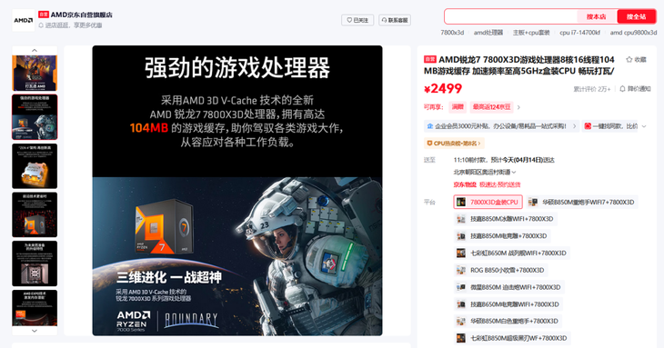 目前AMD 锐龙7 7800X3D处理器在京东自营旗舰店的最新报价是2499元,成为AMD京东自营旗舰店会员还有0元入会抽100元E卡,首购返666京豆和晒单抽AMD定制咖啡杯,加购商品送抽织带挂绳,下单抽AMD信仰周边礼品和冲榜抽电动螺丝刀等活动。