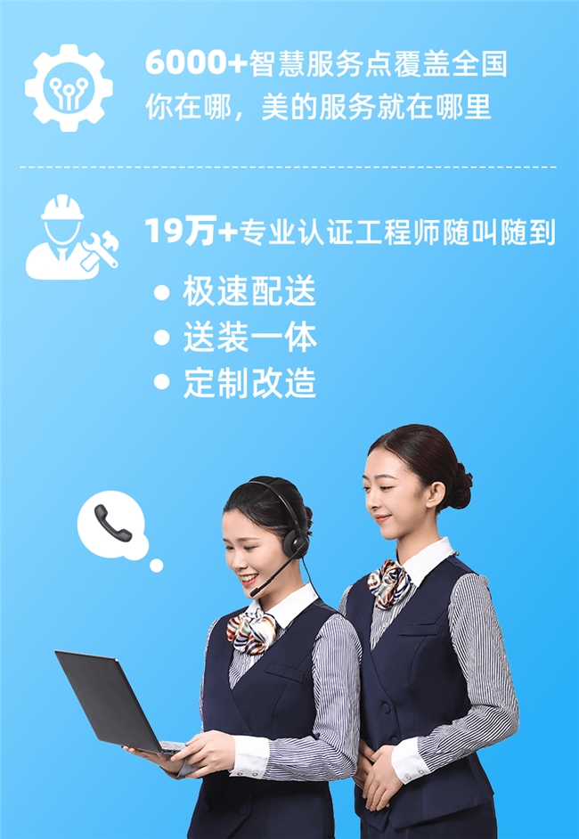 美的售后服务在全国布局6000多个服务网点,拥有19万+专业认证工程师,服务网络实现区县级100%覆盖,部分品类如家用中央空调更是覆盖至乡镇层级,确保无服务盲区。用户下单后,系统实现快速接单、智能派工,2小时内快速响应。7*24小时全渠道客服(包括美的售后400-8899-315热线、微信公众号“美的官方”、“美的Midea”小程序)随时在线,为用户提供不间断支持。