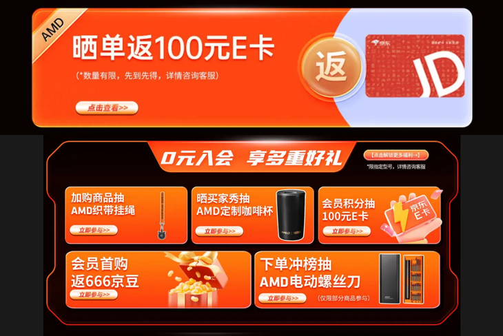 此次AMD 锐龙9 9950X3D2处理器及组装机的预售活动从4月15日上午10点正式开启,并将与4月22日晚上9点截止。首先建议大家成为AMD京东自营旗舰店会员,加入会员后就可以解锁一系列的福利了,会员首购返666京豆,晒单返100元E卡,晒买家秀抽AMD定制咖啡杯,加购商品抽AMD织带挂绳,下单冲榜抽电动螺丝刀,会员积分还可以抽100元E卡等活动。