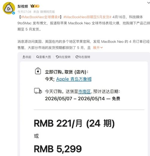 苹果MacBook Neo需求爆火:官网交付延至5月