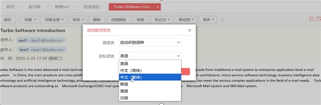该功能内置于TurboEx邮件系统收信和写信模块,用户在邮件收发界面即可完成多语种内容的即时翻译,无需切换至第三方工具或安装浏览器插件。