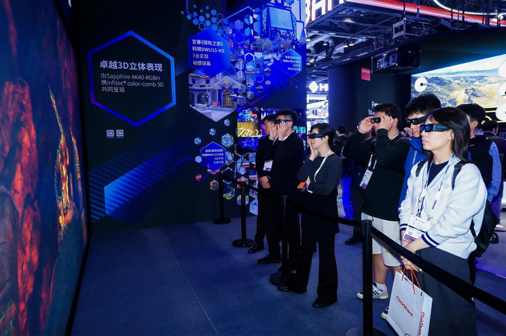 针对沉浸式体验需求,展出的Sapphire 4K40-RGBH投影机成为焦点,其搭载Infitec®色梳3D解决方案,融合RGB纯激光与激光荧光协同光源技术,亮度达40,950流明,支持DCI-P3色域与原生4K分辨率,适配黑暗骑乘、媒介型景点等场景,为创意表达提供充足空间。