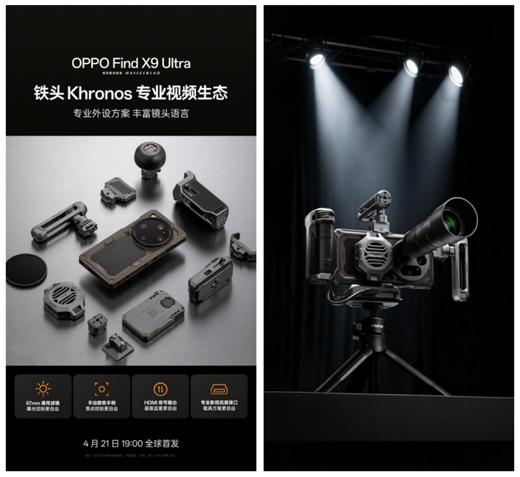 铁头 Khronos 专业视频生态(左),组装形态(右。含OPPO 哈苏专业增距镜 Ultra)