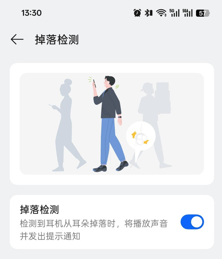 运动佩戴更省心,基于 10000+人耳模型 C 桥,耳机黄金球豆距设计,无论怎么跑跳都不用担心耳机掉落找不到,避免了“一只耳”的尴尬。如不慎掉落,手机会显示“掉落提醒”,另一只耳机伴有声音提醒,避免丢失,细节拉满。