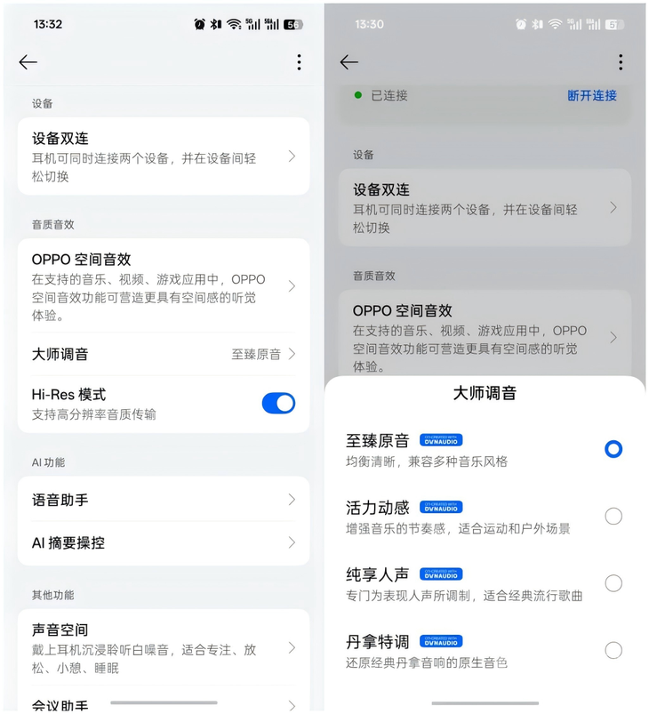 耳机内置至臻原音、纯享人声、活力动感、丹拿特调四种音效模式,可通过欢律 APP 自由切换,满足流行、人声、古典、电音等不同曲风需求。相较于同价位耳夹耳机,它的音质解析力、声场表现、调音完成度均处于第—梯队,彻底解决开放式耳机声音发散、低频疲软的痛点。