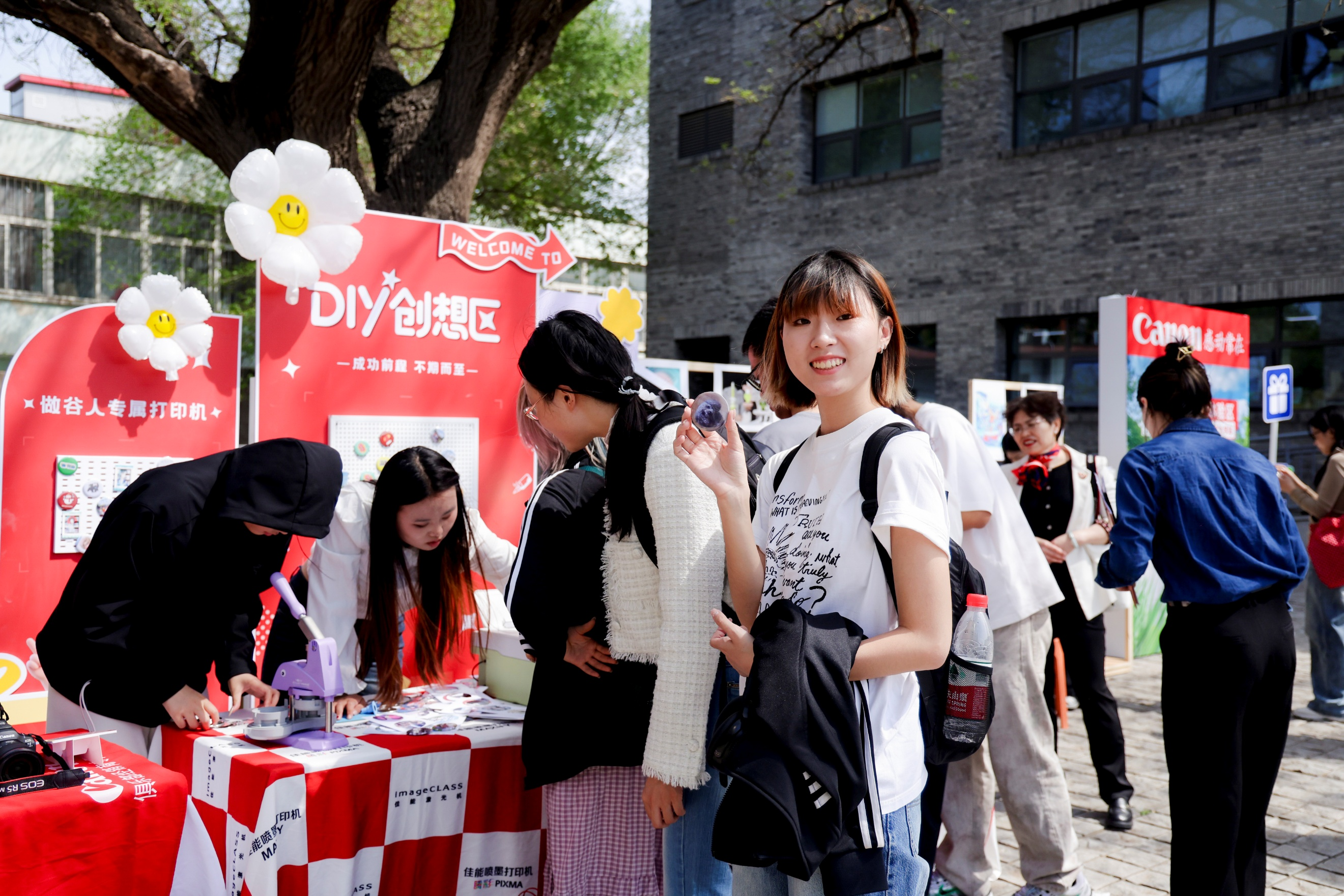 佳能产品体验区还特别设置了二次元周边制作体验环节,吧唧DIY和热缩片DIY深受北京大学同学们的喜爱。参与者可亲手制作二次元周边徽章,或通过绘制、热缩、滴胶等步骤完成独一无二的热缩片挂件。这些互动体验不仅让同学们感受到佳能打印机在多介质输出、高品质打印方面的优势,更将“打出好前程”的主题融入轻松有趣的创作过程中,让同学们在动手实践中体会创意落地的成就感。