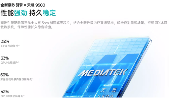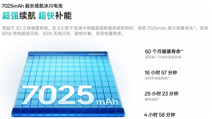 * 7025mAh冰川电池:配合天玑9500芯片的优秀能效,提供了“拍一天也不会有续航焦虑”的强劲续航能力,彻底告别电量焦虑。