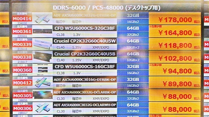 与此同时,64GB(32GB×2)DDR5-4800内存套装也首次跌破8万日元,较上月价格下降约21.8%。此外,DDR5-5600、6000和6400等规格的64GB套装同样出现了约10%的降价,但多数产品仍停留在8万日元以上,这显示出高频型号的价格也有所松动。
