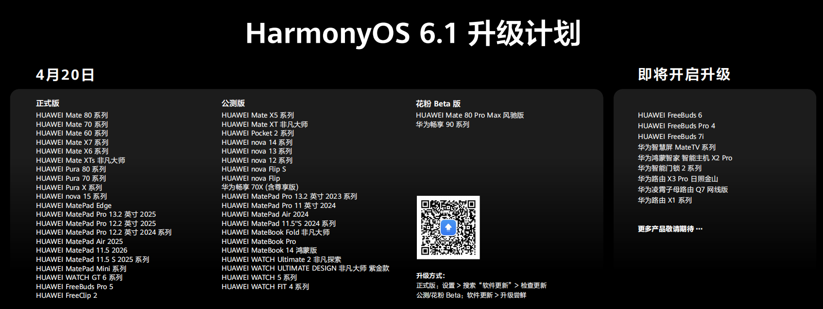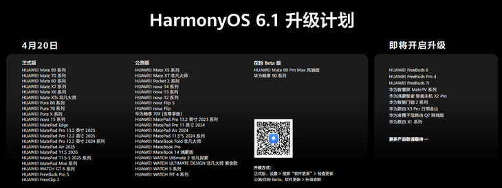 据悉, Mate 80、Pura 80、nova 13等数十款主流机型,也将在2026年第二季度逐步收到HarmonyOS 6.1升级推送,让更多用户享受到更流畅、更安全、更智能的系统体验,感受鸿蒙带来的交互革新。