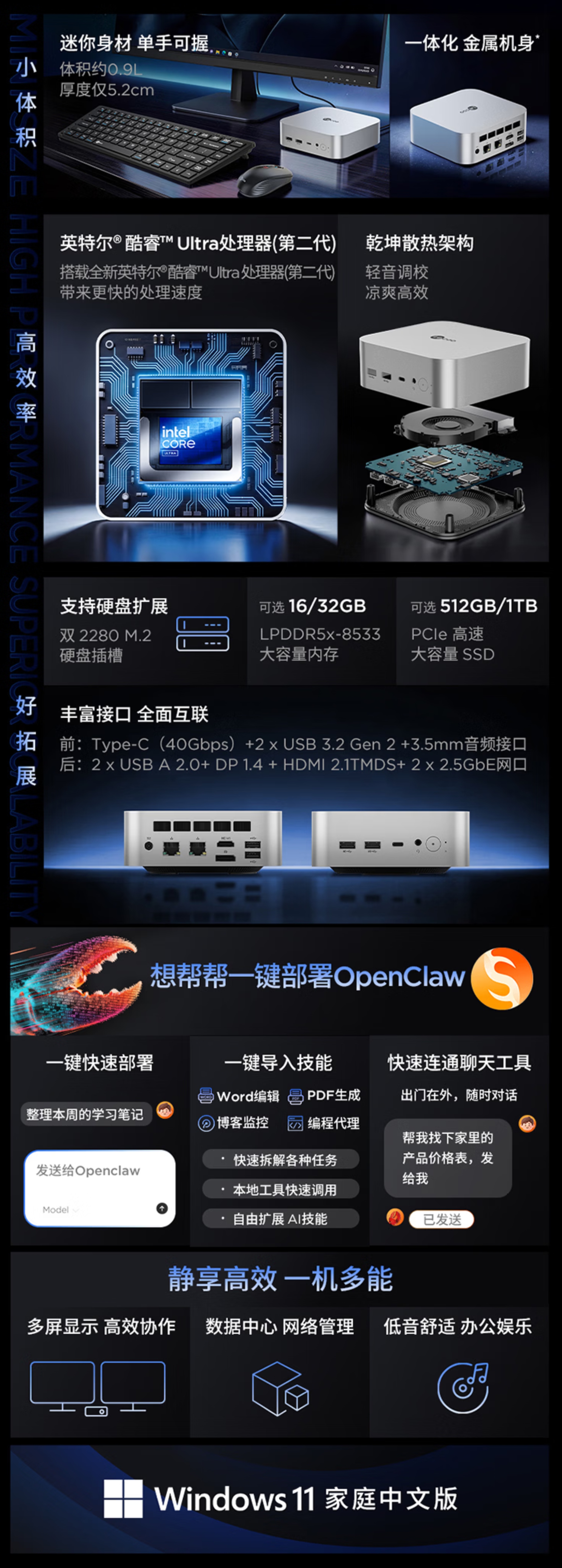 AI能力与场景适配方面,该机支持想帮帮一键部署OpenClaw,可实现AI环境一键部署、AI技能一键导入,全面覆盖Word编辑、PDF生成、编程代理等办公与创作场景,大幅提升使用效率。产品预装正版Windows 11家庭中文版,可完美适配多屏高效协作、数据中心网络管理、日常办公娱乐等多元场景,为职场办公人群、创意从业者与数码爱好者,提供了小体积、高性能、强拓展的桌面终端新选择。
